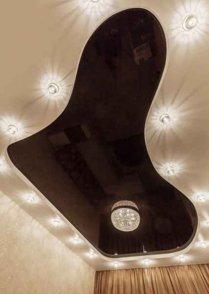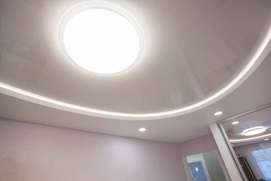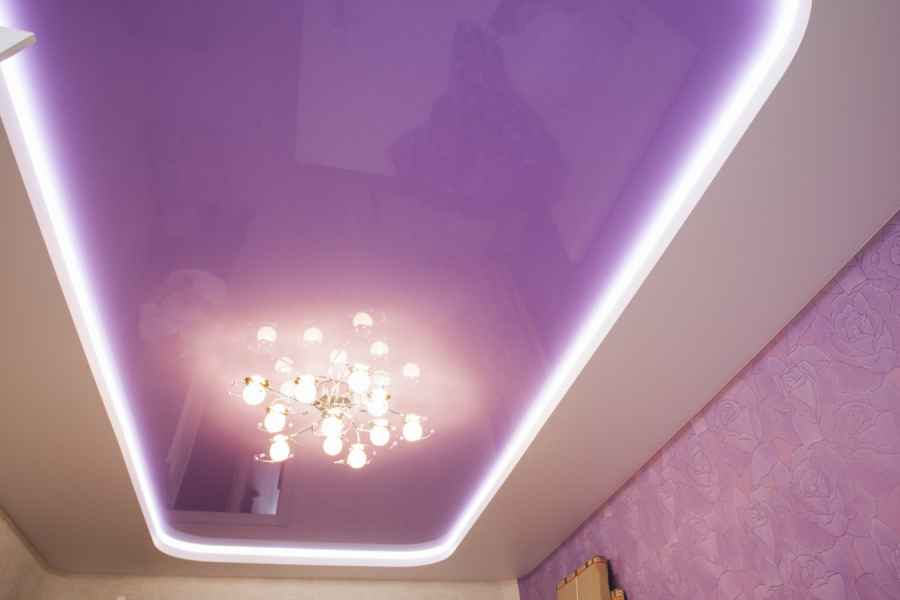 Двухуровневые натяжные потолки с подсветкой имеют множество вариантов (точечные светильники, LED-ленты, запленочное свечение) «парящих» полотен, фигур, мягкого свечения, смены изображения при активации источника света.