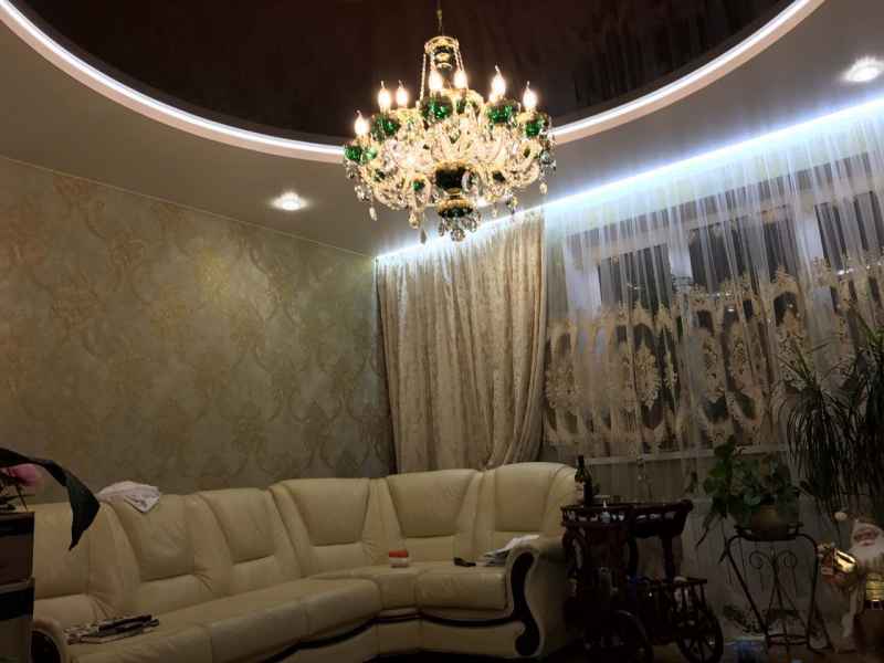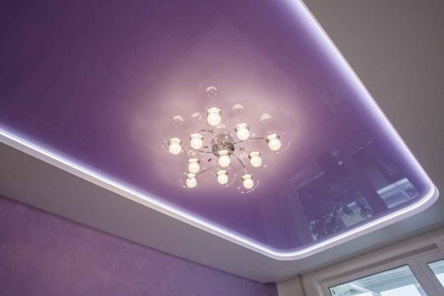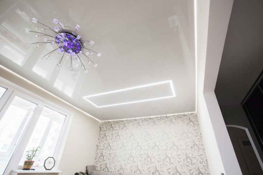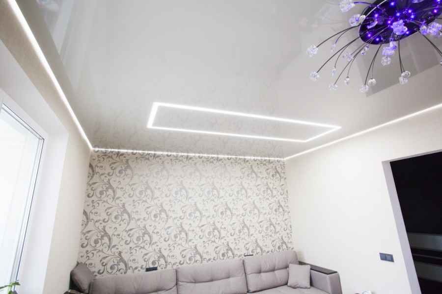 К тому же можно выбрать всегда уместный простой, классический вариант (к примеру, матовый потолок неброской расцветки), а можно устроить ультратрендовую гостиную в стиле хай-тек или модерн.