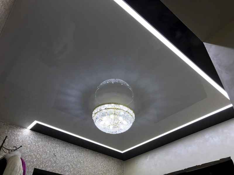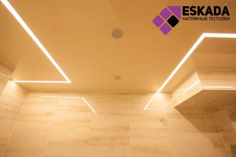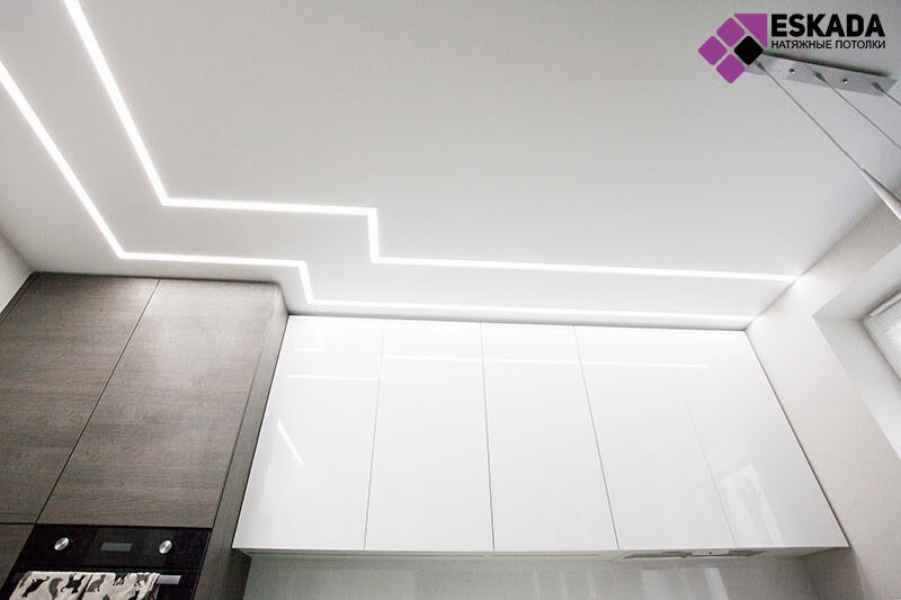 Потолок с парящими линиями создает уникальную атмосферу уюта, выделяя подсветкой определенные зоны. Конструкция состоит из LED-ленты шириной 5 или 8 см, закрепленной таким образом, что светильник закрыт самим полотном или специальной светорассеивающей пленкой. Из-за этого и создается эффект парения. Длина и конфигурация светильника может быть, какой угодно – это зависит от предпочтений заказчика.