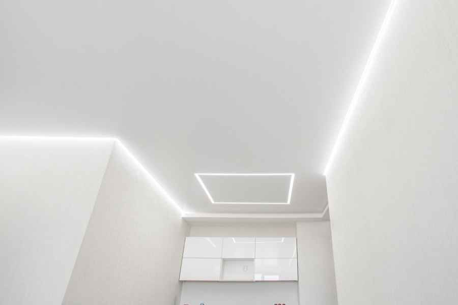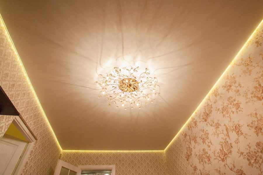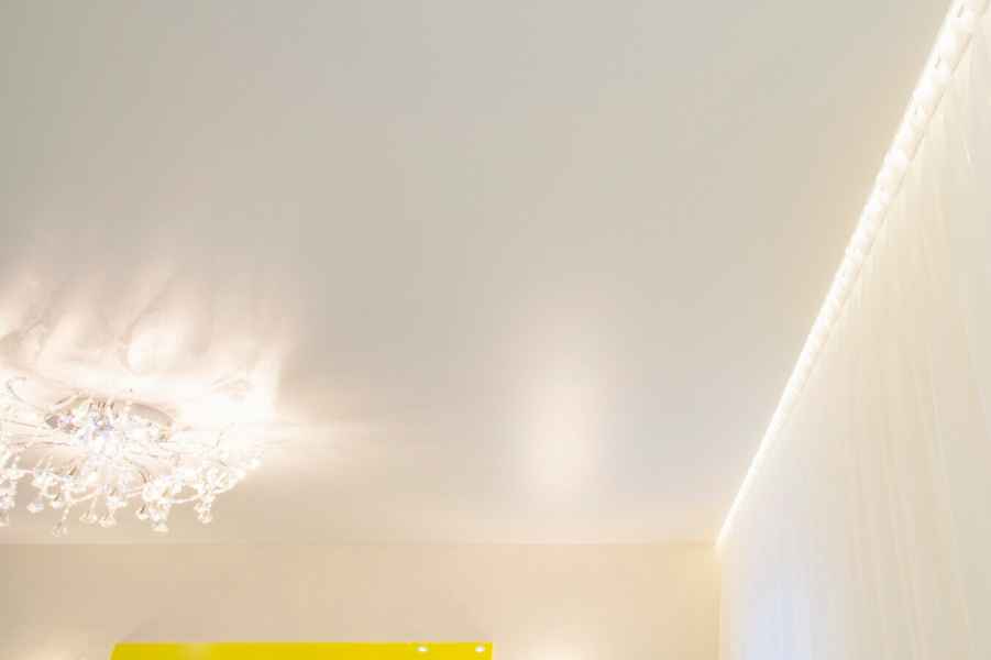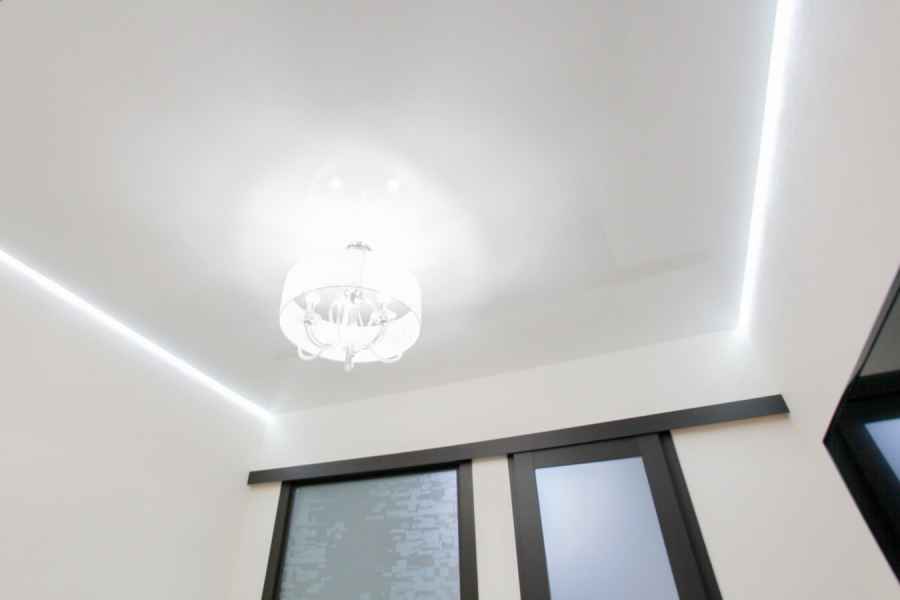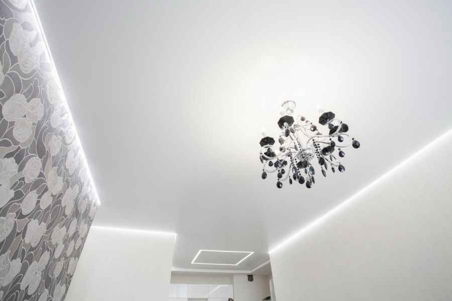 Одним из видов потолочного покрытия является парящий потолок, вошедший в моду совсем недавно. Конструкция не зря получила такое название - все выглядит так, как будто полотно парит в воздухе, не касаясь стен, мягко подсвеченное по контуру. Потрясающий эффект создается при помощи установки светодиодной ленты в профиль по всему периметру устанавливаемой конструкции.