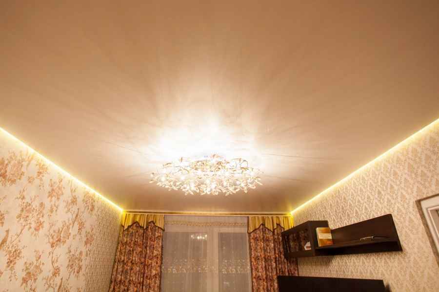 Особенно выразительно этот эффект смотрится со ступенчатыми, двухуровневыми, многоуровневыми потолками. Освещение скрывает переходы между уровнями, отчего кажется, что каждый из них располагается в другой плоскости, независимо от остальных. Комбинация однотонных полотен и рисунков на каком-либо участке в ореоле подсветки выглядит просто волшебно.